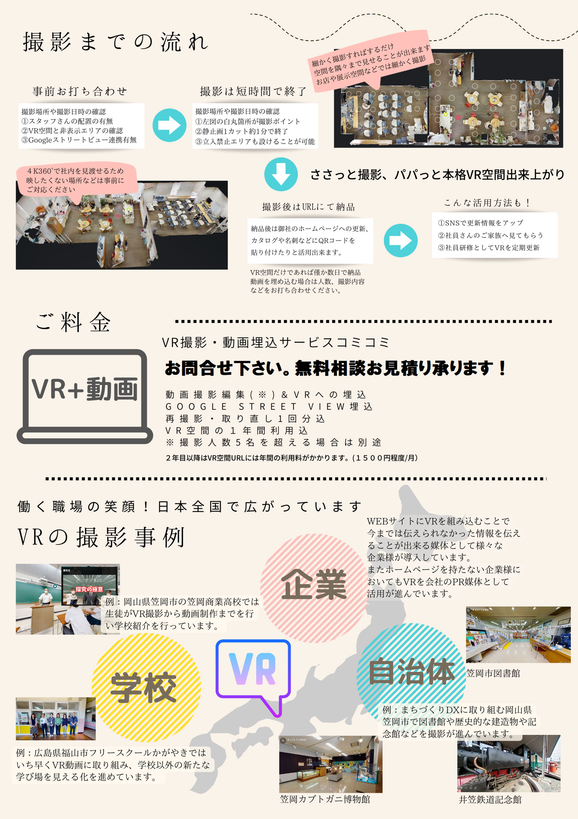 施設案内では直接来館できないお客様にもアプローチが可能。見たい角度から見て頂けるので一方的な映像にならないのもVRの魅力。 観光地PR・ライブ撮影・もちろん静止画も撮影可能!アイディア次第で様々な活用方法がありますので、ぜひお気軽にお問合せ下さい。